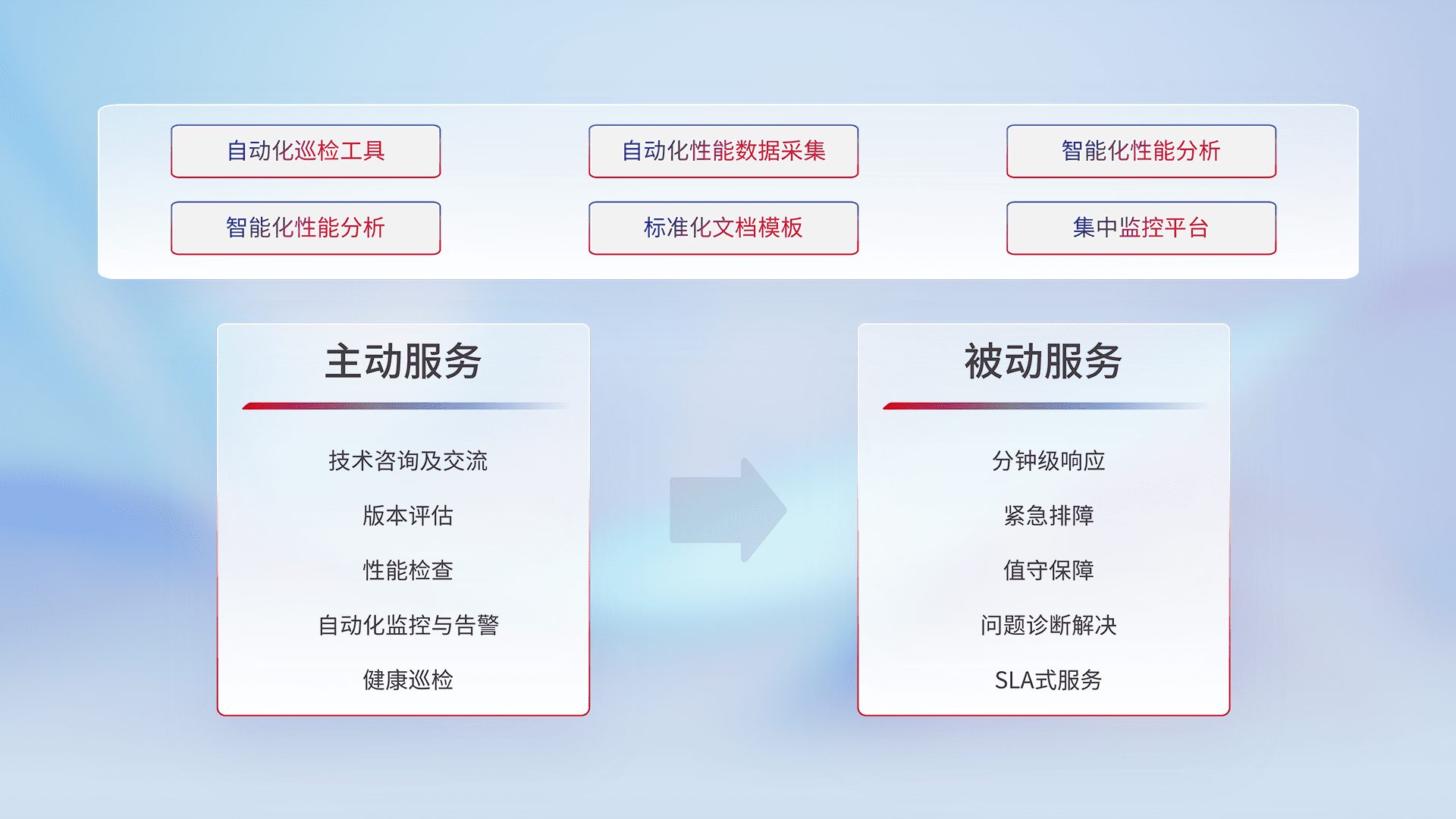 智能化工具和标准化文档,,,保障服务质量,,,,提供主动服务(包含技术咨询、、、版本评估、、、性能检查、、、自动化监控与告警、、健康巡检)和被动服务包含(分钟级响应、、紧急排障、、、、值守保障、、、问题诊断解决、、SLA服务)。。。
