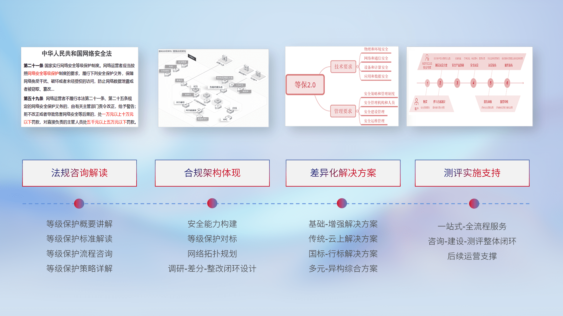 通过专业的法律咨询解读、、、、合规架构体现、、差异化解决方案、、、测试实施支持等服务,,,为客户量身打造等保合规体系。。。。